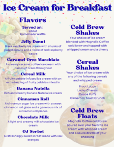 • Breakfast-inspired ice cream flavors served on donuts or Belgian waffles