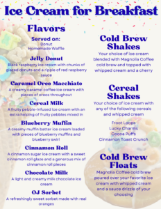 - Breakfast-inspired ice cream flavors served on donuts or Belgian waffles